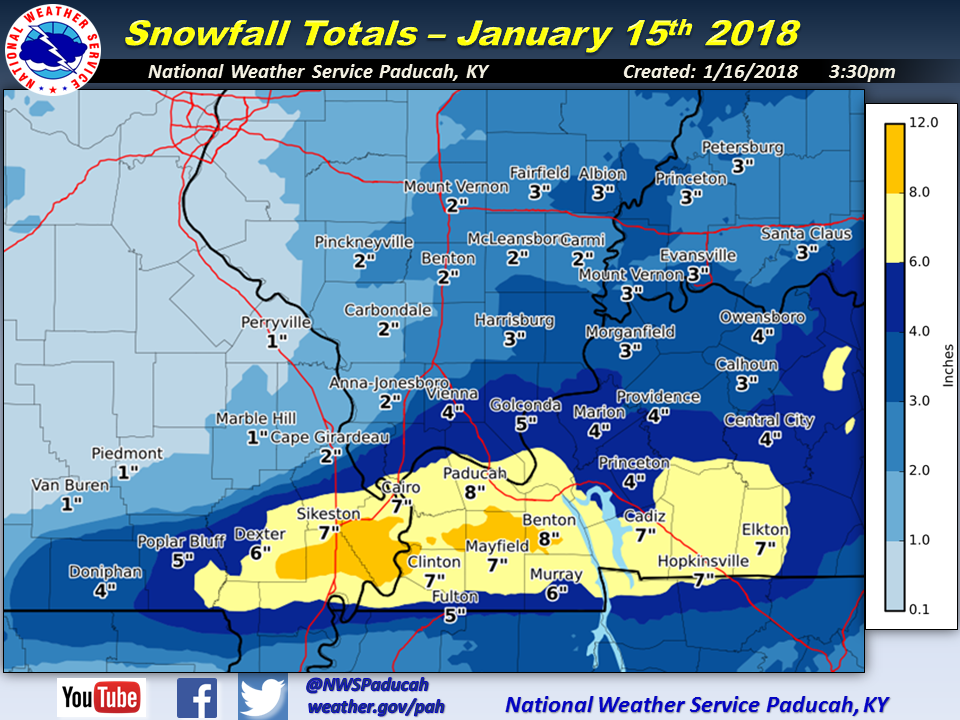 Figure4:  This map is courtesy of the NWS of Paducah and shows the snowfall amounts for the 15th.