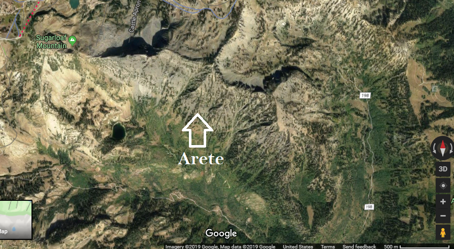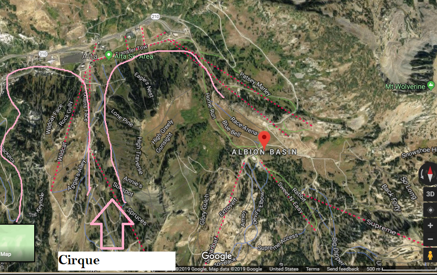 The impacts of glaciers during the last Ice Age is also very important in the history of Little Cottonwood Canyon. The steep canyon walls of Little Cottonwood Canyon were formed by these Alpine Glaciers. Glaciers have tremendous erosion power and can move/pluck hundred’s of feet of rock. The U-Shaped valley (see Figure 3 courtesy of the Alta Historical Society). These glaciers also form other spectacular landforms such as Cirques which are amphitheater shaped landforms formed by the erosion of glaciers at the head of a mountain valley. Albion Basin in Alta is a classic Little Cottonwood Canyon example. An Arete is a shape ridge that is formed when two or more glaciers erode adjacent/parallel valleys (see Figure 4).