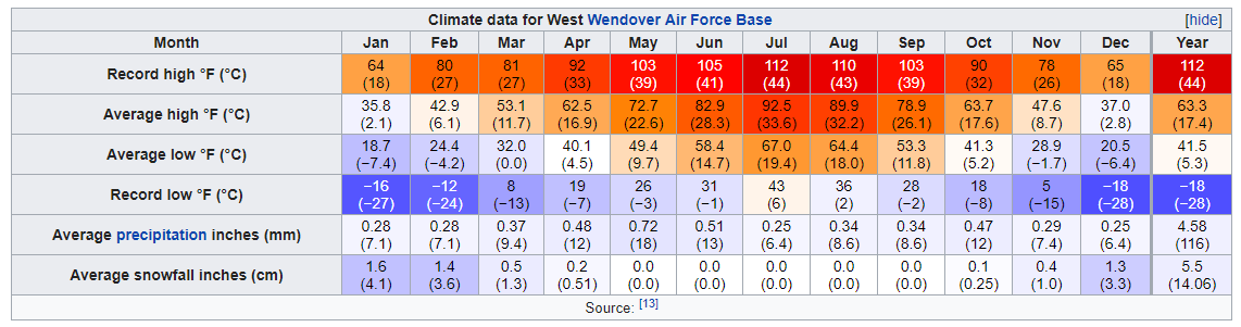 Figure 2: This is the climate table for Wendover, Utah which is on the Utah/Nevada border courtesy of Wikipedia and the Western Regional Climate Center. Areas closer to the Great Salt Lake receive a bit more precipitation and snow.