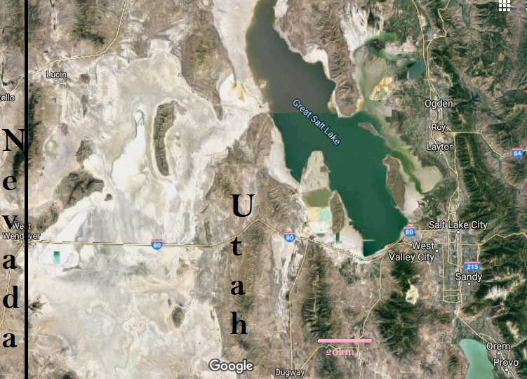 Figure 1: Courtesy of Google Maps, this is a map of the Great Salt Lake and the Bonneville Salt Flats relative to Salt Lake City Metro and the Nevada/Utah state line. The white/light gray area is the Bonneville Salt Flats.