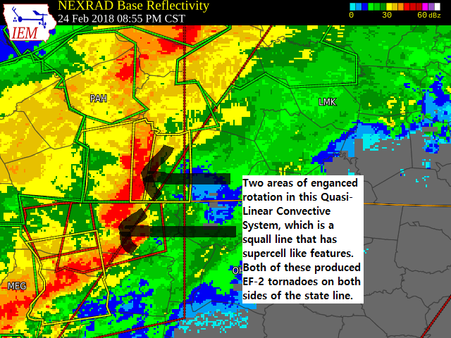The first round occurred with a discrete supercell (see the IEM Radar image below) that formed in the mid-afternoon. This produced 2 tornadoes, including a deadly high-end EF-2 tornado in Southern Logan County. Significantly damaging a few homes and a family farm. Sadly 1 fatality occurred, which at the time ended a 10-year streak for our area, in which we went without a tornado fatality. Another tornado (EF-1) occurred near the Warren/Barren County line with this round.
