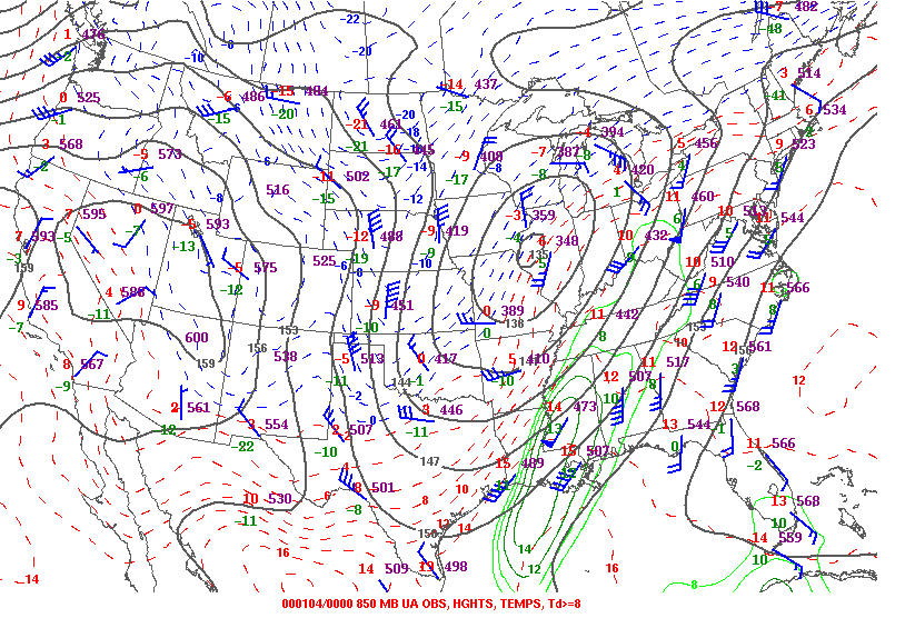 We have our 850mb (lower levels about 5,000 feet off the surface) map from the Storm Prediction Center on 1/3/2000. We can see the green contours showing rich moisture moving into our area, and a surface low between St. Louis and where Iowa/Illinois/Missouri meet. Several of our tornado events