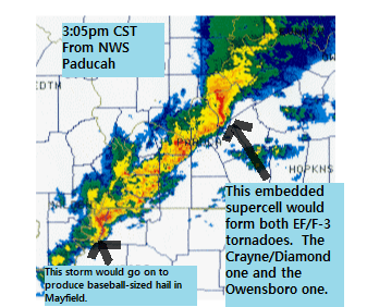 The more significant round of severe weather arrived between 3-6pm across the area. A strong squall line with embedded supercells moved into our region as seen below from the image by the National Weather Service’s Paducah radar taken at 3:05pm CST