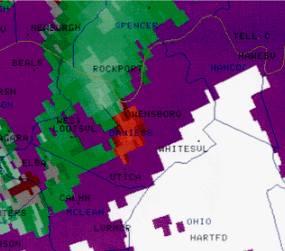 From the NWS of Paducah, a radar image as the tornado touched down just southwest of town and was moving into Owensboro. The reds and greens show winds moving toward vs moving away from the radar. When the greens and reds come together that is called a couplet and is a sign of a tornado in progress.