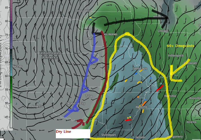 This setup featured a strong low-pressure system over Iowa moving into the Great Lakes area (a very similar track to the Providence/Nebo 2002 tornado and the North Hopkinsville/Northern Todd 2006 tornado setup). Dewpoints quickly rise at about 60F, with temperatures in the 67-70F range (we had lows in the 30s to start this month), leading to a very favorable dewpoint/temperature departure and low LCL heights. A boundary either warm-front or a leftover convection boundary may have been present across our area as well.