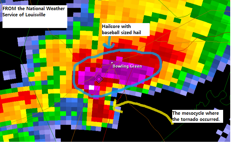 The hailstorm as it moved across Bowling Green, from the NWS of Louisville. Showing both the hailcore and the mesoscale/hook.