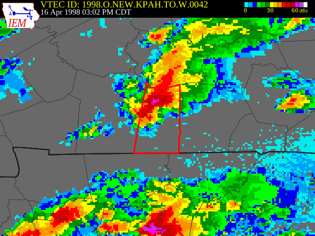 On April 16th, 1998 a significant low-pressure system is moving across the Great Lakes, with a strong low-level jet through Middle TN into Kentucky. A High Risk was in effect in the KY/TN border down into Middle TN. A broad-based trough allowed for subtle to moderate around of forcing, enough to form discrete supercells across the area. A very warm and humid airmass was in place as well allowing for storms to quickly become severe. In our area, our significant supercell was from one singular supercell that formed in the Southern Jackson Purchase and then quickly became severe into Christian County. The storm produced a downburst of over 90-100MPH winds on the northside of Hopkinsville causing 2 injuries due to damage to a mobile home. This storm moved into Todd County and produced golfball sized hail in the northern part of the county.