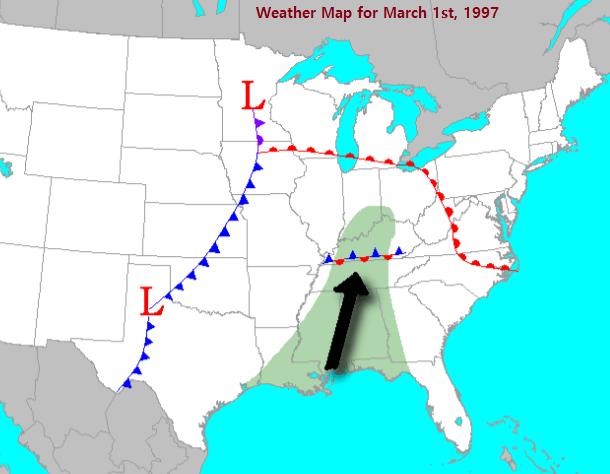 At event #12 is the final event on our all-time Top-40 weather event list from the 1990s. At the end of February into the 1st day of March, a very heavy rain event begun and it kept raining through the morning of the 2nd. A stalled-out boundary along US Highway 68 led to rounds of heavy rain with 1-2 inch per hour rainfall rates. The atmosphere was extremely saturated at about twice the normal levels for March.