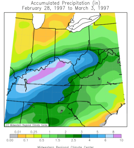 This was the most significant weather event of the 1990s. It is one of three events that caused over $100 million dollars this decade, but this one was also deadly with 2 fatalities across our area and 17 across the state of Kentucky. Thousands of homes were flooded in this event and every county experienced road closures and disruptions to travel. Schools were closed up to 2 weeks in several areas, especially along the Ohio and Green Rivers. For the Green River and Ohio River in the Henderson/Owensboro area this is the worst flood as far as impact/damage in modern (post-1937) times.
