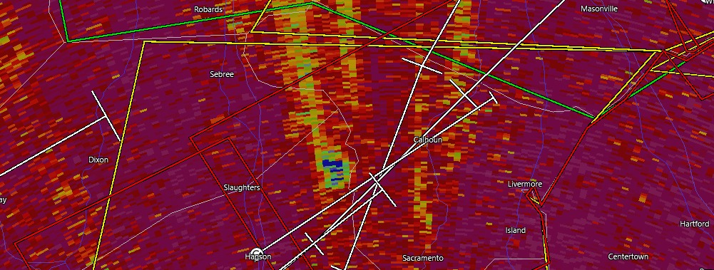 Throughout the evening, there were multiple circulations and embedded supercells along the line. If not producing tornadoes, the line produced widespread 50-60+ MPH winds across the area. One moved from NW TN and moved in Murray, producing an EF-1 tornado that thankfully was weakening as it moved into the city. The most impactful was a circulation that produced an EF-1 tornado in the Madisonville area, damaging the Humane Society building, before moving and dissipating between Hanson and Jewel City. Following that storm, an EF-2 tornado touched down and impacted Calhoun proper in McLean County, causing some damage to farm structures, roof damage, and significant damage to power poles in the general area. Thankfully, the strongest winds likely remained just above ground level, preventing an even more significant impact to Calhoun. At one point 10 tornado warnings were in effect at one time from the Owensboro area down into the Trigg/Christian County area.